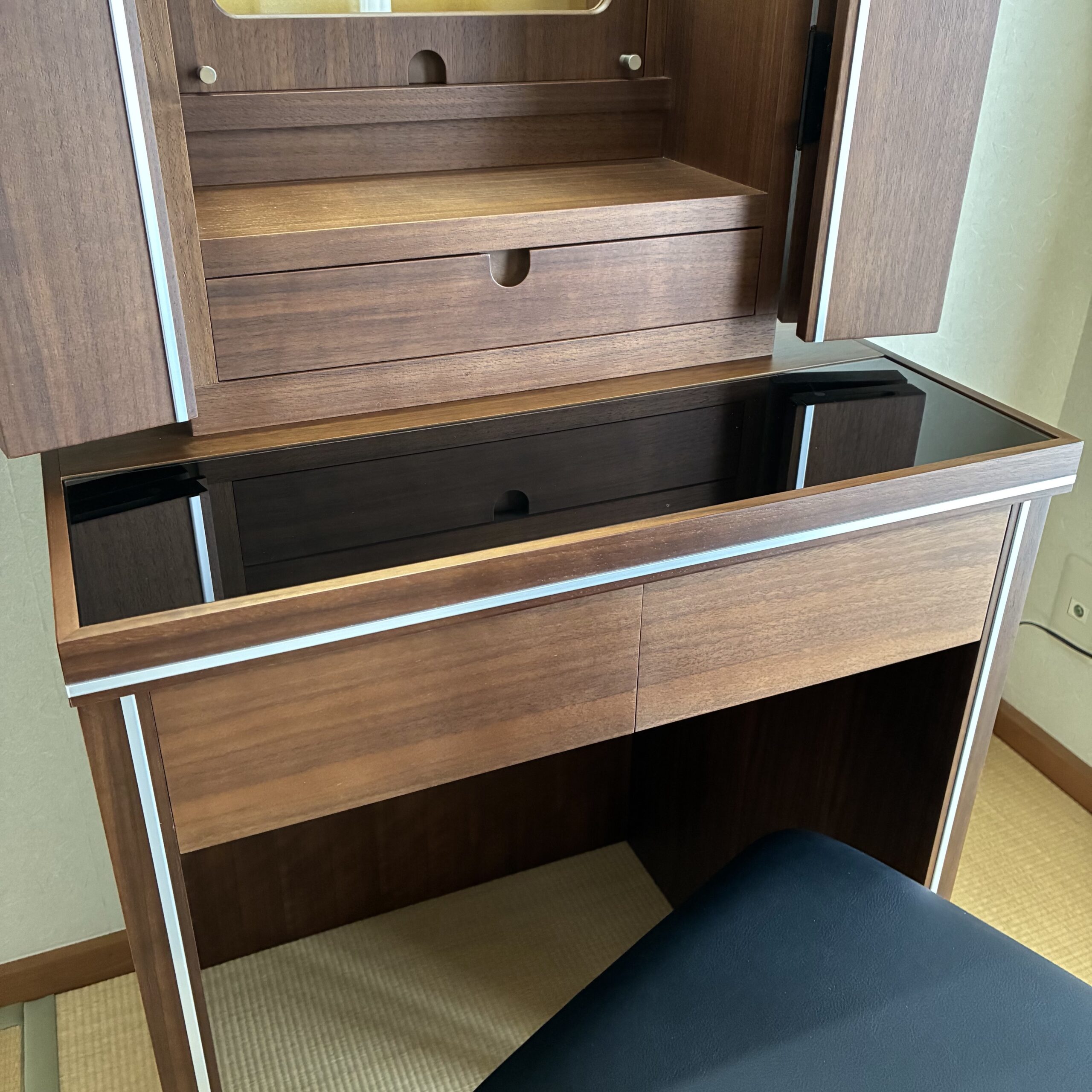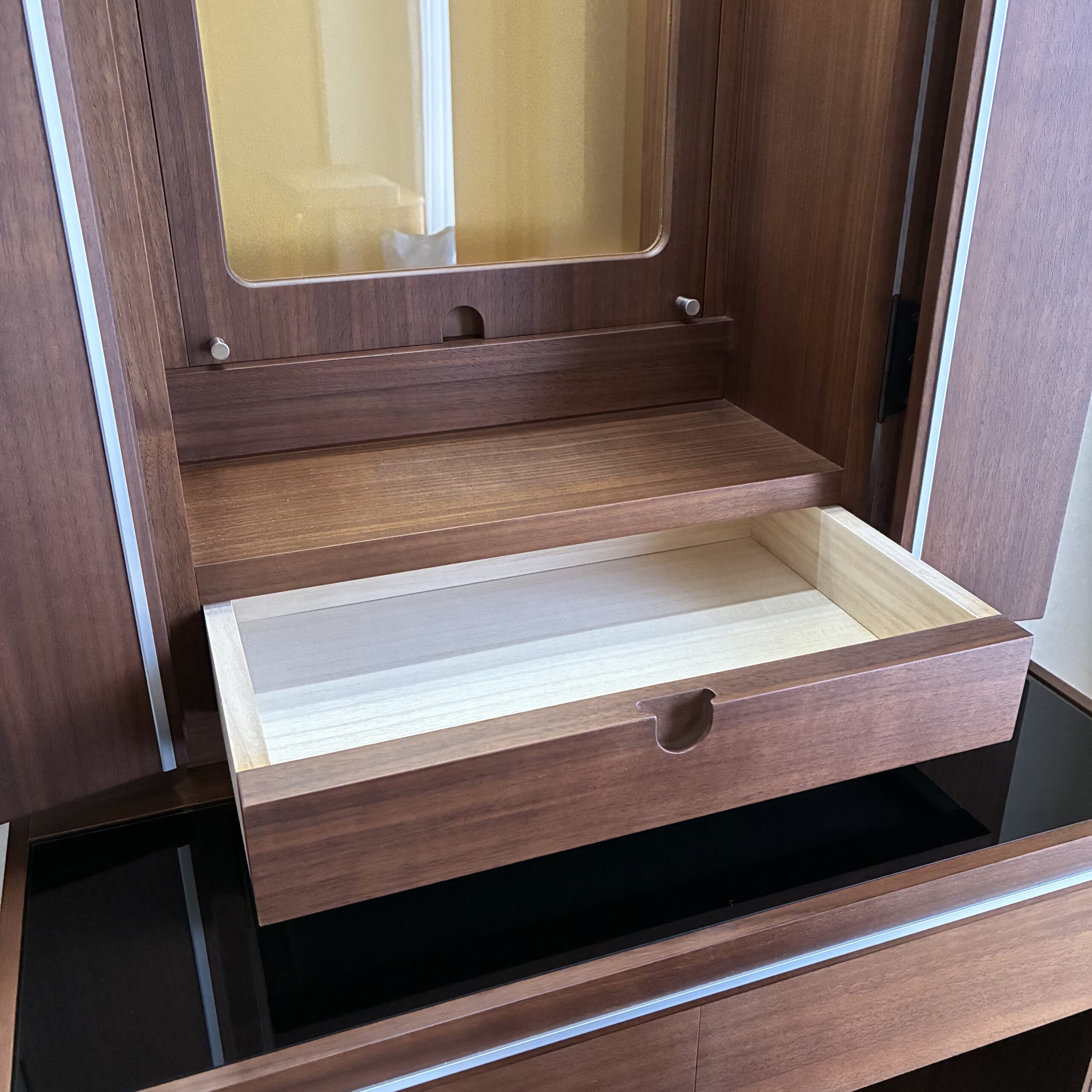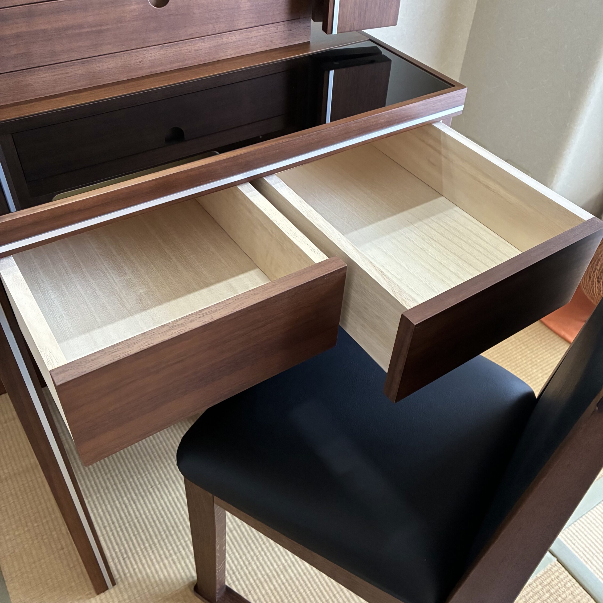 上台に一杯、下台に二杯と引き出しも有り、特に下台引き出しは通常の家具調の引き出しよりも深く、しっかりと収納が出来ます。