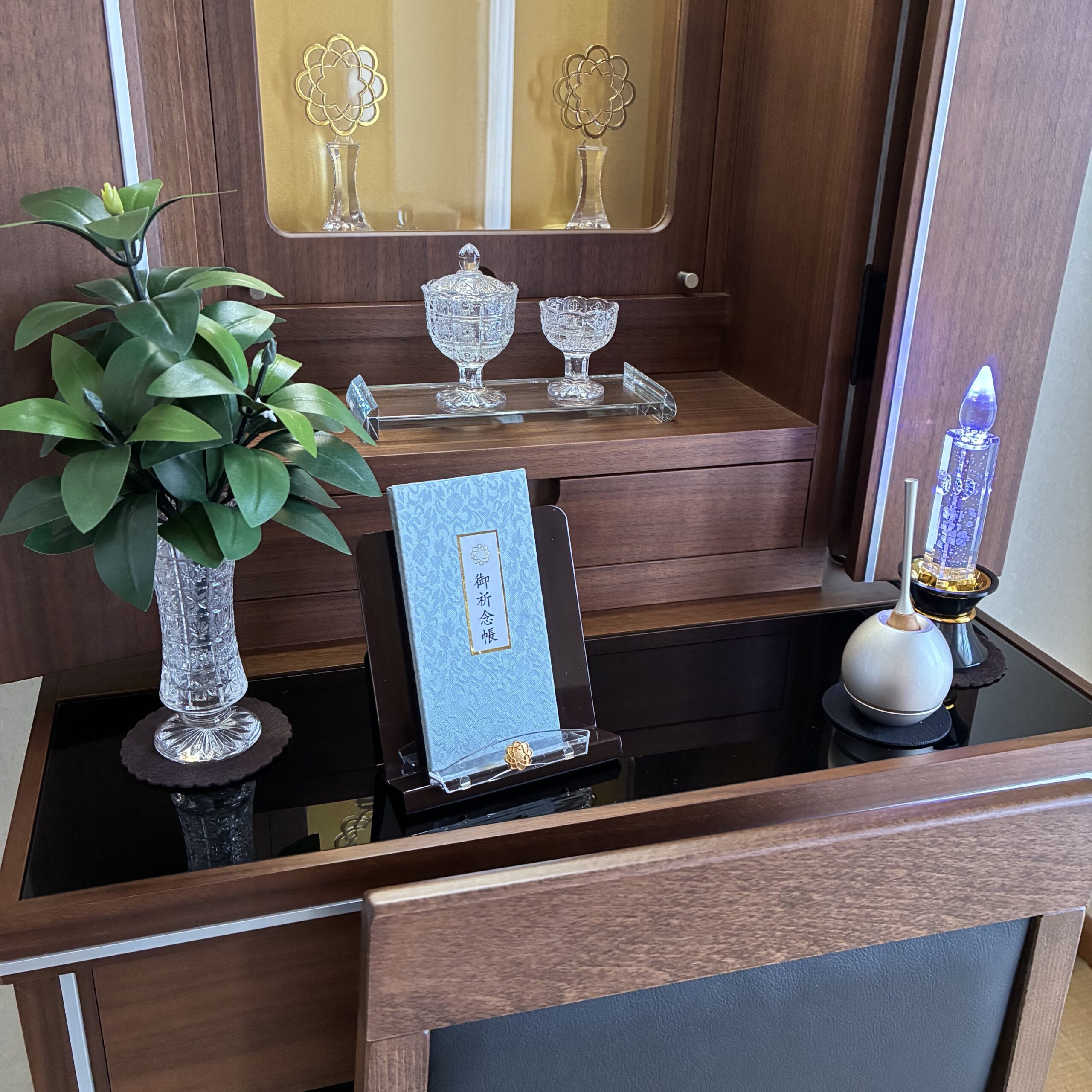 仏具はクリスタルで統一、音色が綺麗なチェリンシルバーにより一層重厚感ある仕様にてご準備させて頂きました。
