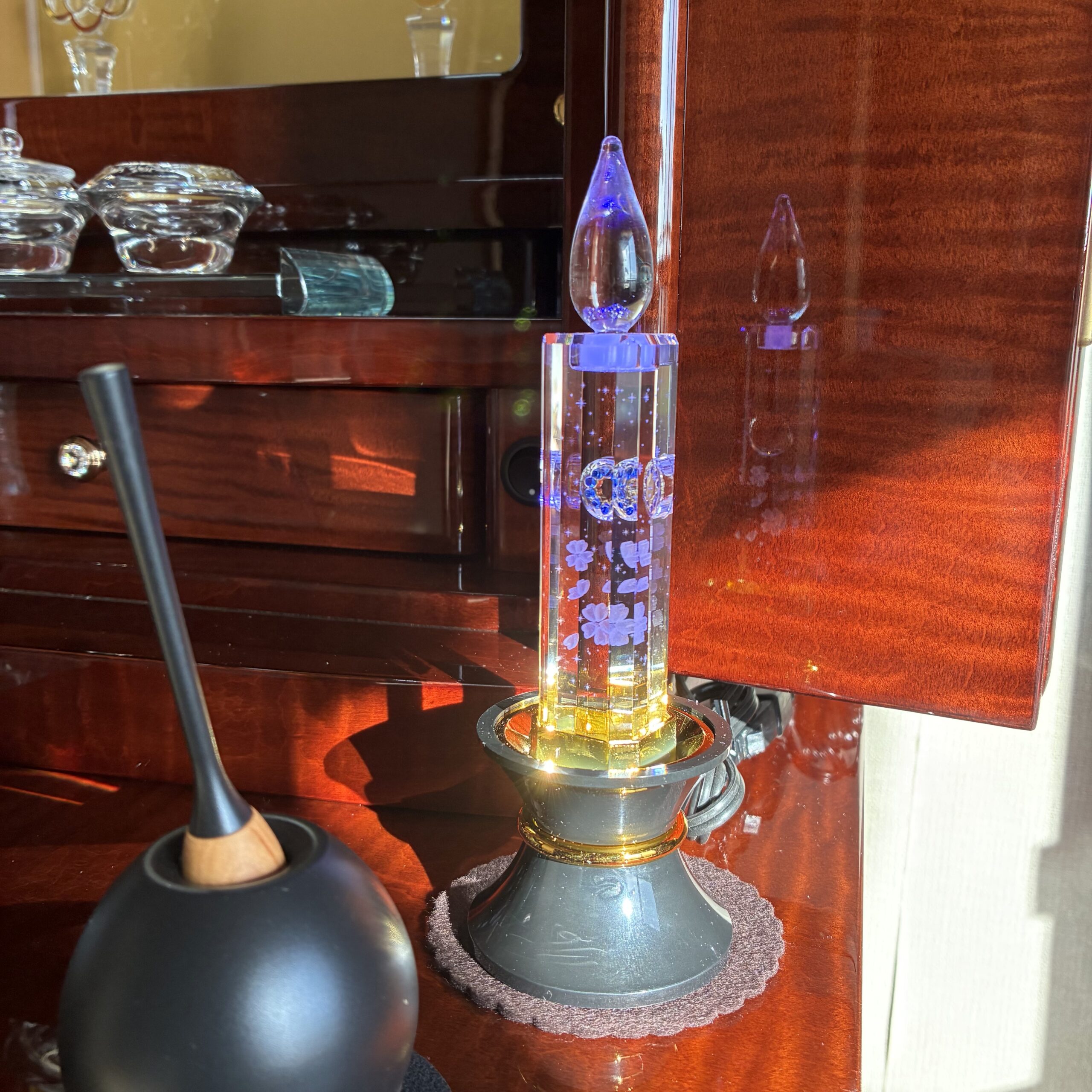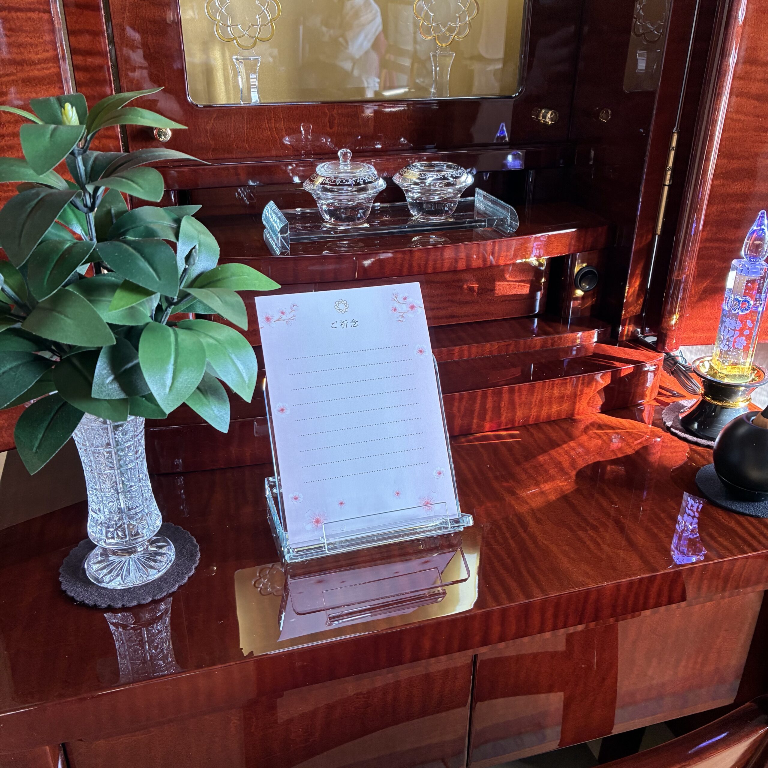 仏具はクリスタルで統一、音色が綺麗なチェリンブラック、一層上品な仕様にてご準備させて頂きました。