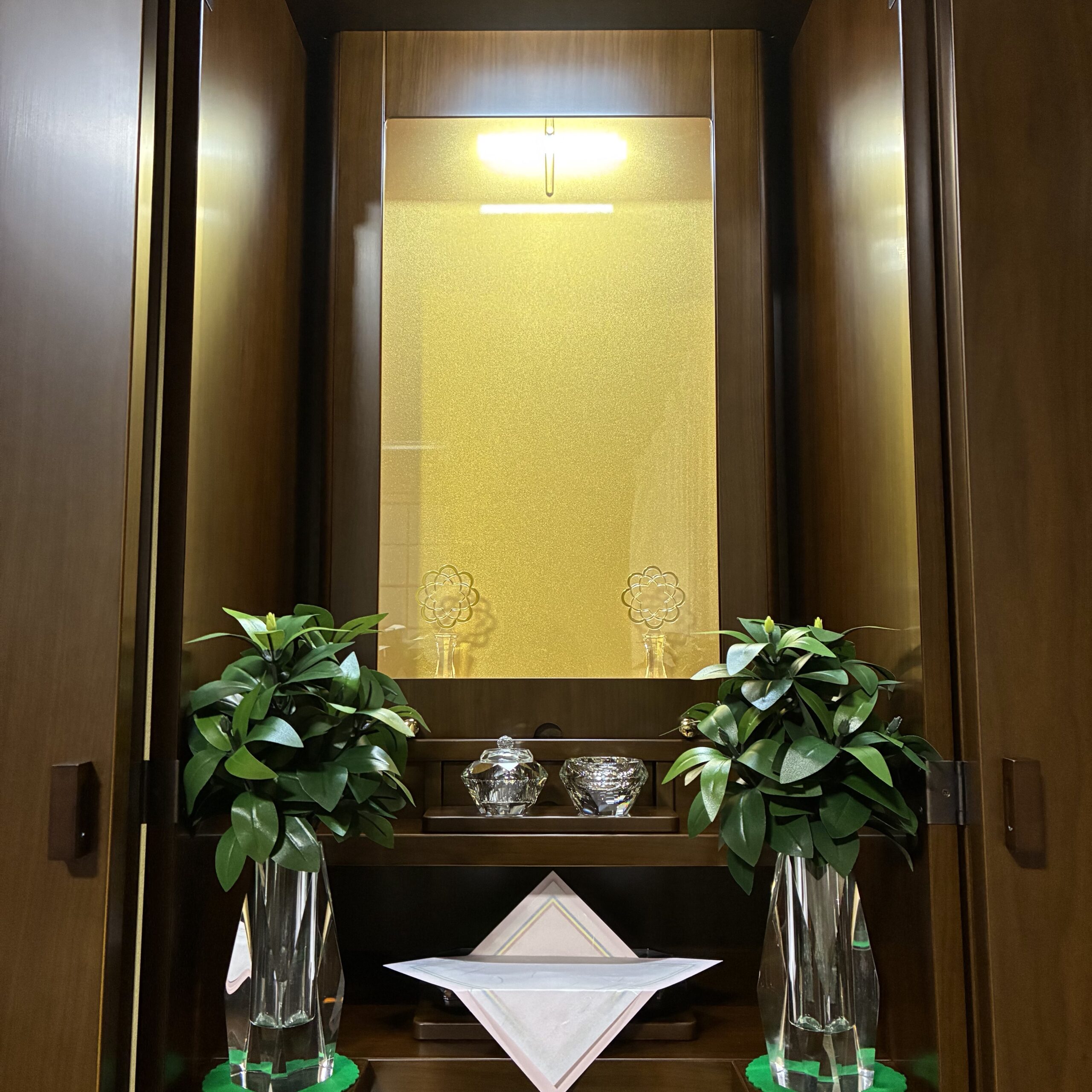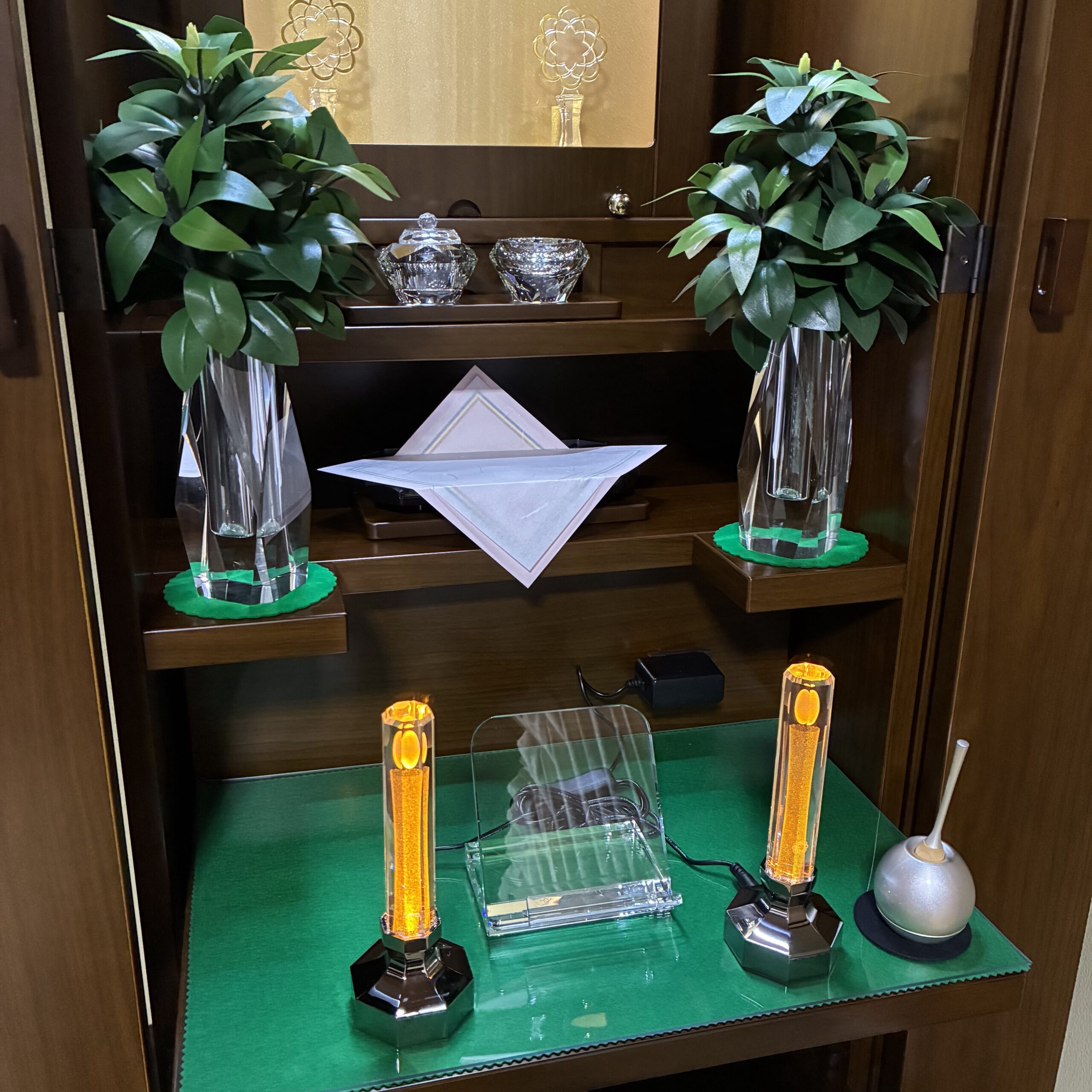お客様のご希望をお聞きしながら仏具はクリスタルで統一しご用意させて頂きました。