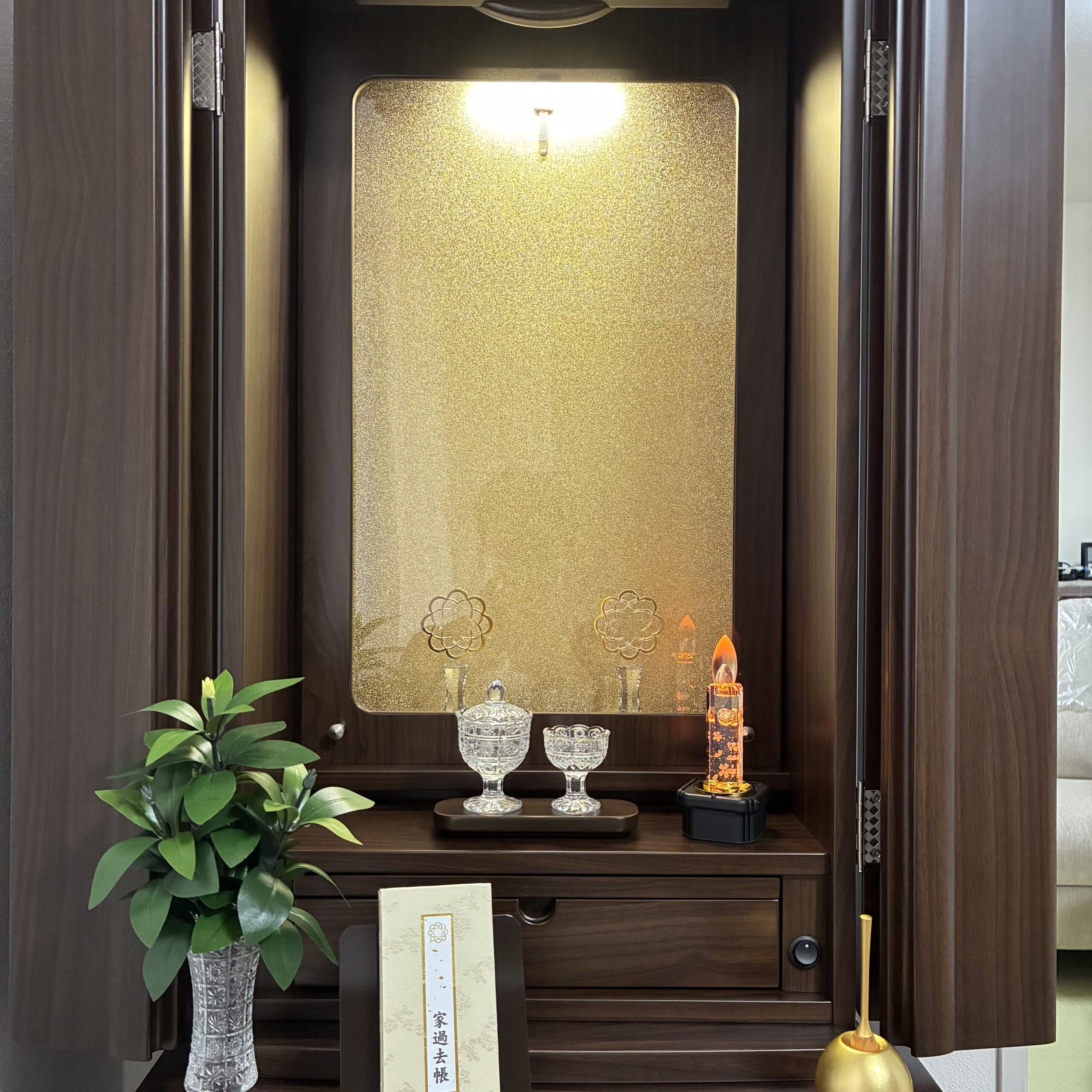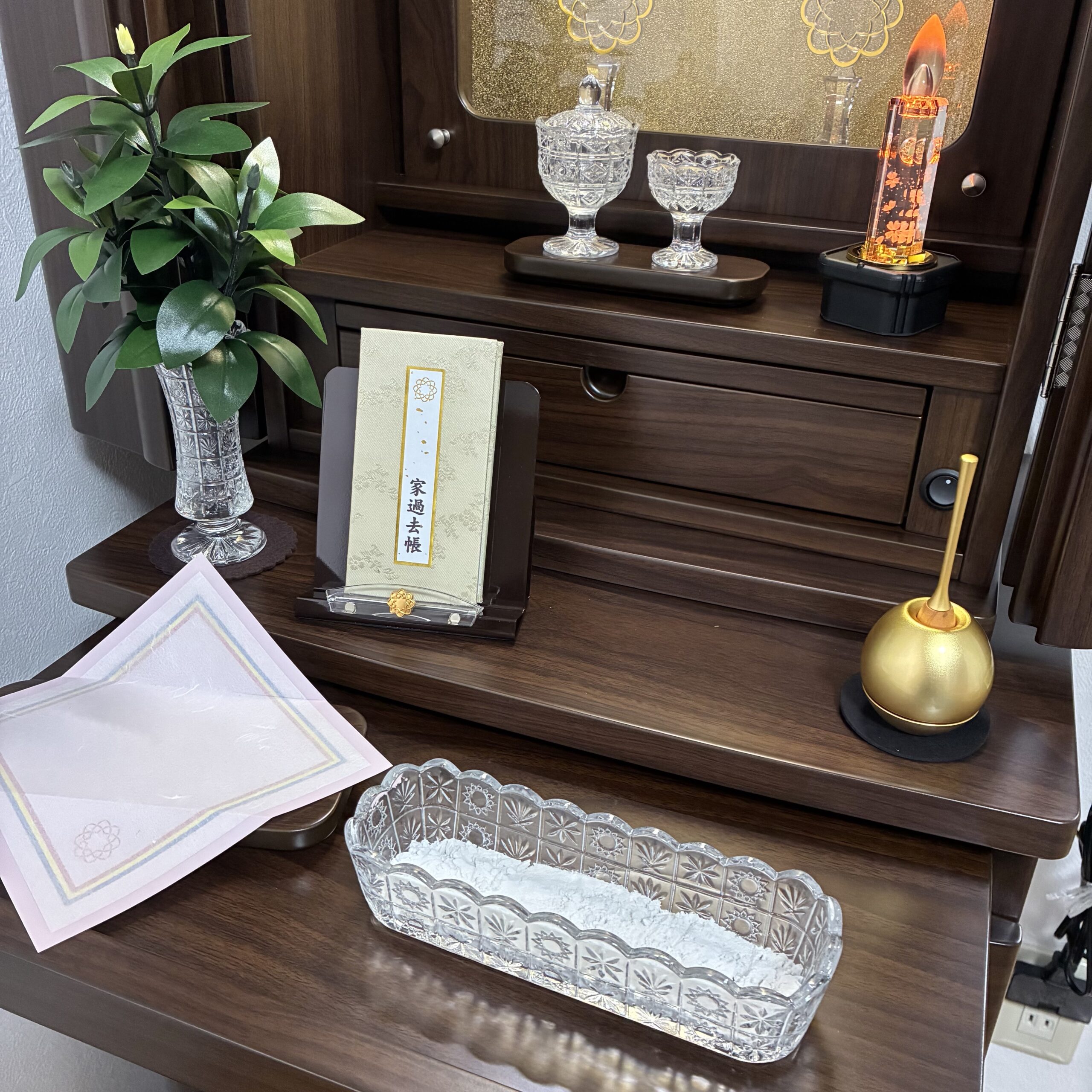 お客様のご希望をお聞きしながら仏具にはクリスタル仏具を中心にご準備させていただきました。